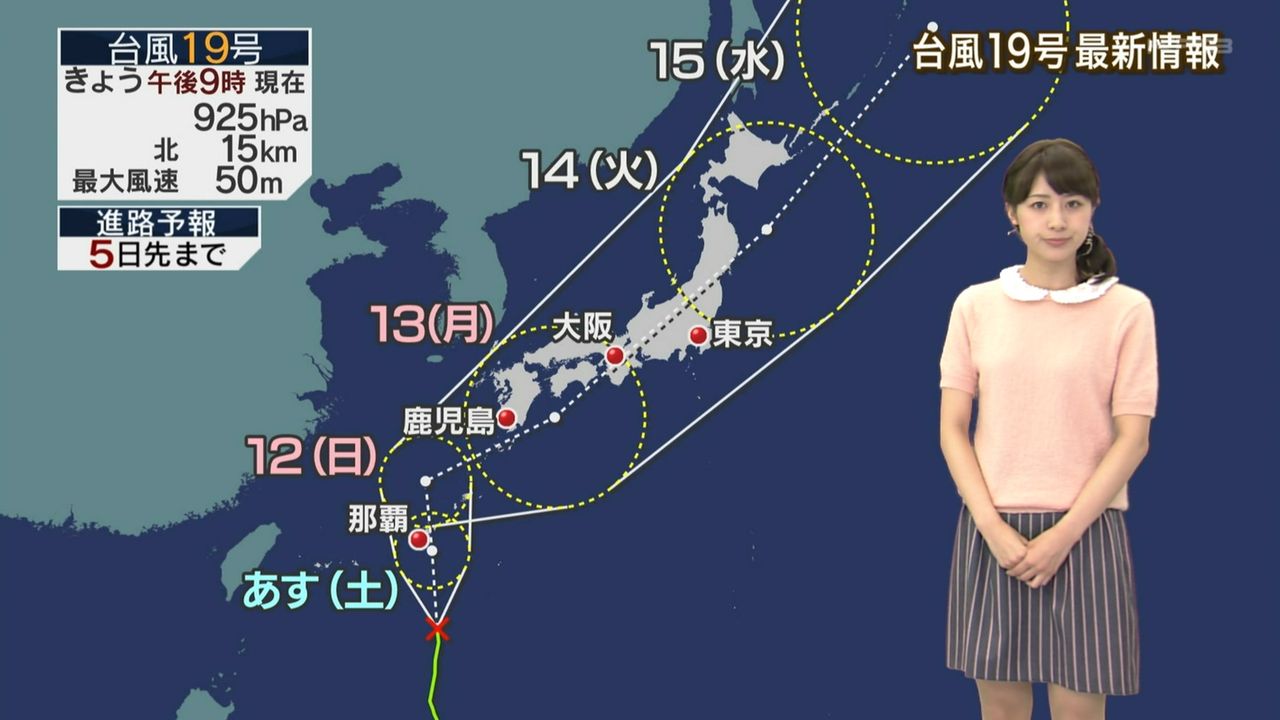 気象庁の予報によると13日15時に九州付近。