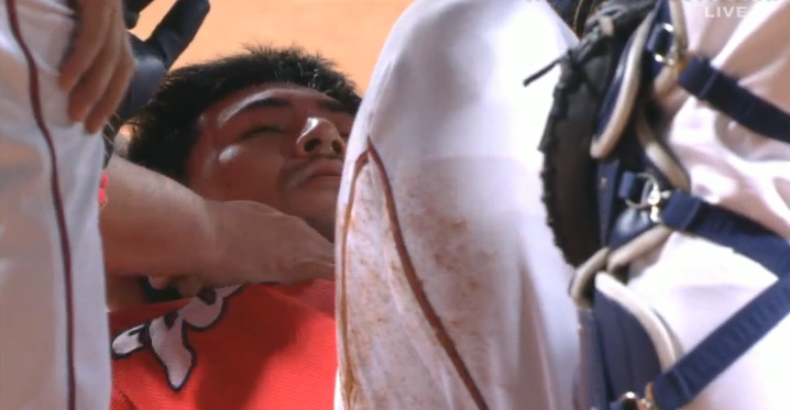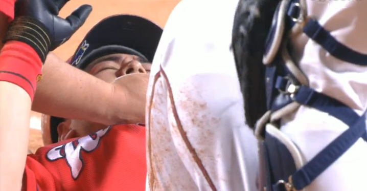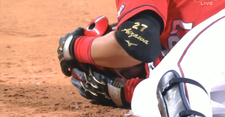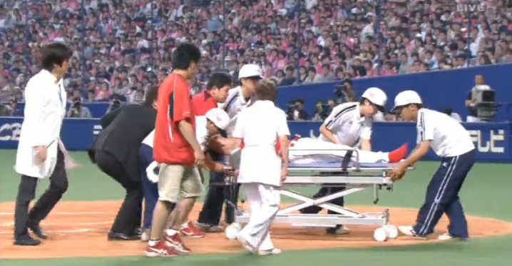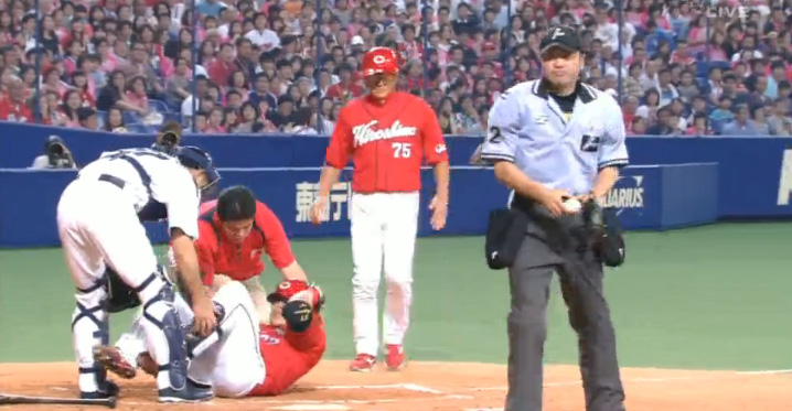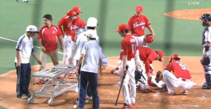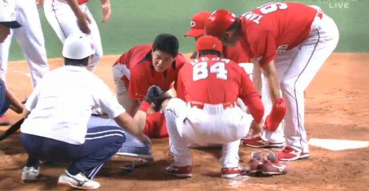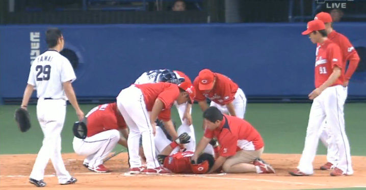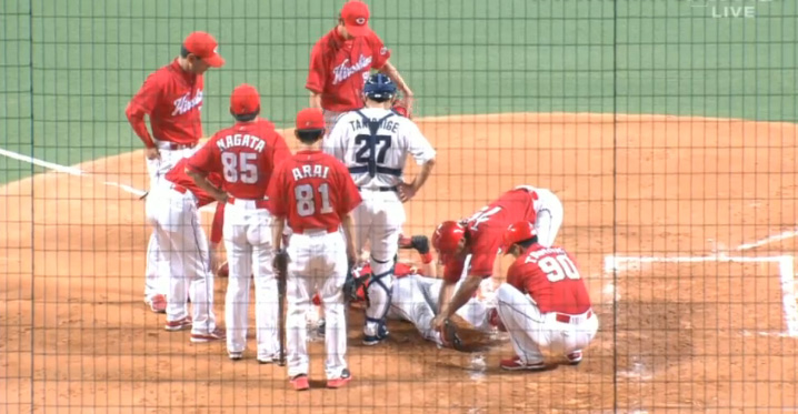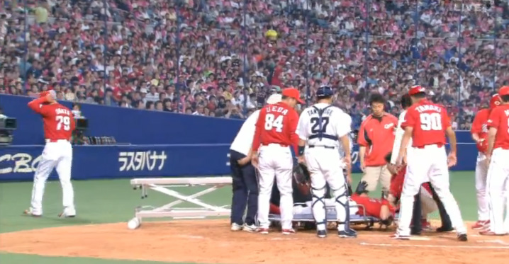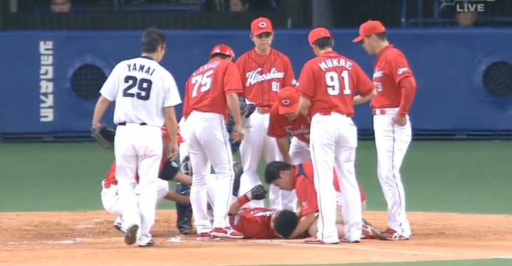 山井は危険球により即退場。2番手として左腕の岡田が急きょ、マウンドに登った。ベンチ裏で治療を終えた会沢はグラウンドに戻り、そのまま一塁走者としてプレーに復帰した。