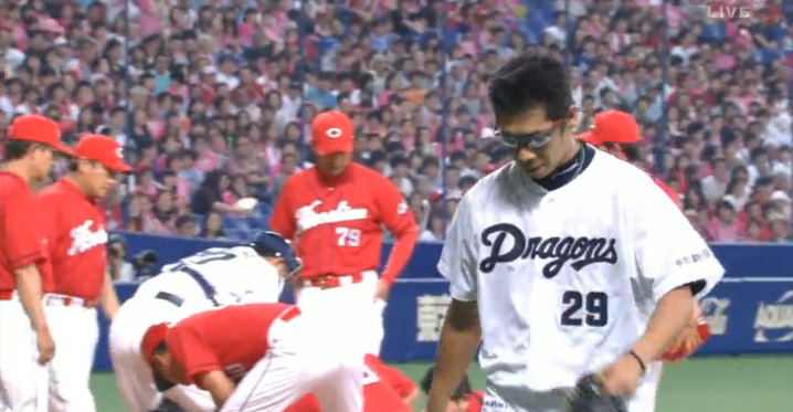 中日の先発・山井が三回、広島の会沢に頭部死球を与え、危険球で退場となった。