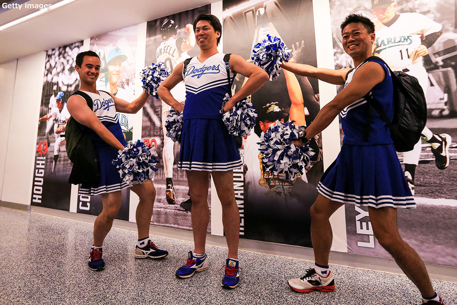 現地時間9月11日(日本時間12日)の試合後、球場から出てきた前田の姿に大爆笑。ポンポンを手に、ミニスカートを履いたまさかの“チアガール姿”で登場したのだ。