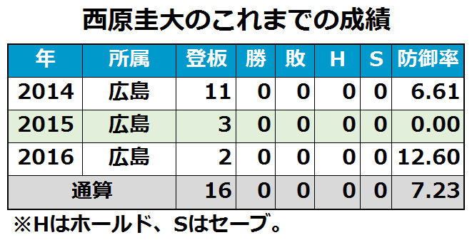 西原は今治北高、関西外大、ニチダイを経て2013年度ドラフト4巡目で広島に入団。14年には11試合に登板したが、わずか3年での解雇通告となった。前日22日までフェニックス・リーグ不参加メンバーとともに、2軍施設で練習を続けていた。