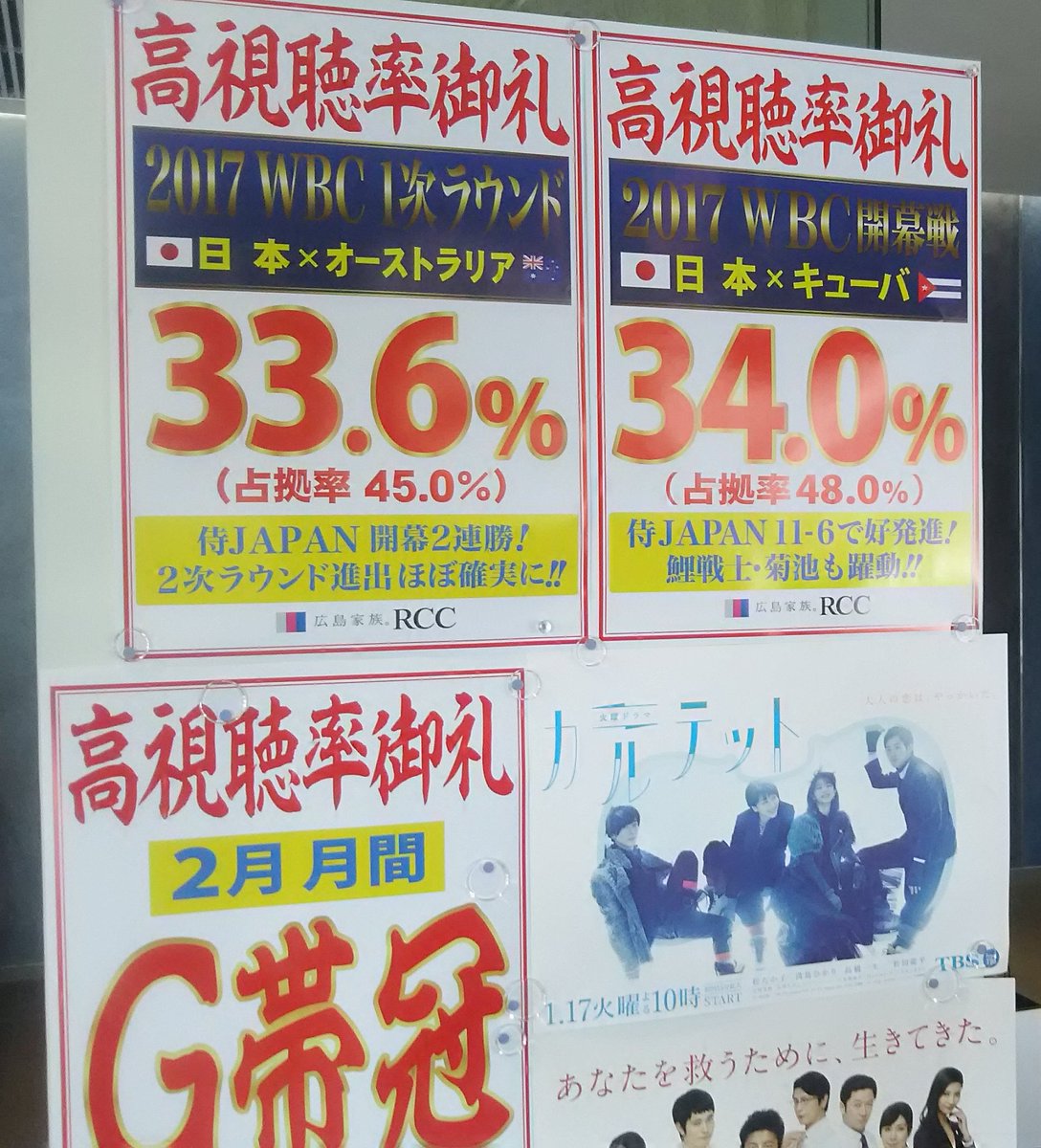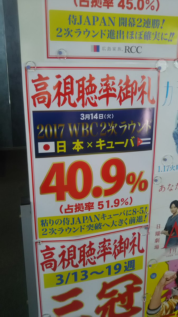【#高視聴率御礼】『#WBC 1次ラウンド第2戦「#侍ジャパン×オーストラリア」』の広島地区視聴率は、第1戦に続き、全国トップの高視聴率を獲得!