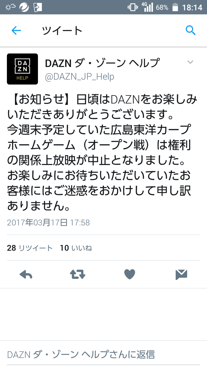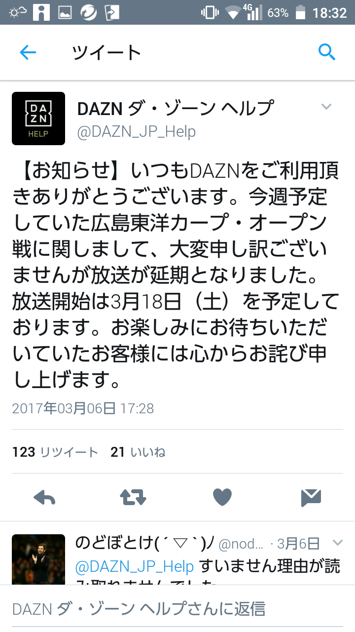 @DAZN_JP_Help 1カ月無料期間で、契約継続するか判断したいのですが、開幕までにカープの試合が配信されるのかどうか、本問い合わせの返信で明確にしてください。その回答で今後の契約決めたいと思いますので。