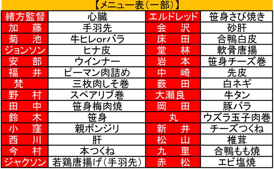 メニューは45種類。毎年、選手が入れ替わる中で、開幕前には全店舗の店長などが集まり、今季のメニューに載る選手を決める「編成会議」が開かれる。昨年の成績や近年の活躍度合い、そして将来への期待値…。木下氏がキャンプ中に日南を訪れ、選手の情報を収集。今季、活躍しそうな選手を見つけて進言することもある。今年は2度、いずれも約1時間の熱い議論が交わされ、栄えある「1軍メンバー」が決まった。