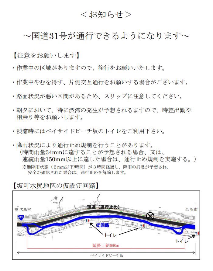 国道31号の通行止め解除のお知らせを、平たく言いますと、