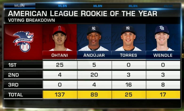 全米野球記者協会の投票は3人連記。1位票に5点、2位票に3点、3位票に1点が与えられ、その得点合計で受賞者が決まる。ア・リーグ新人王部門では大谷は29人中25人から1位に選ばれて125点を獲得。2位は4人(12点)で3位はいなかったため、合計得点は127点となった。