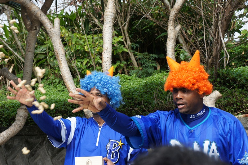 今日は節分。ローレンスとレグナルトの両投手が豆まきしました。なかなかの球(豆)速が出ていました。