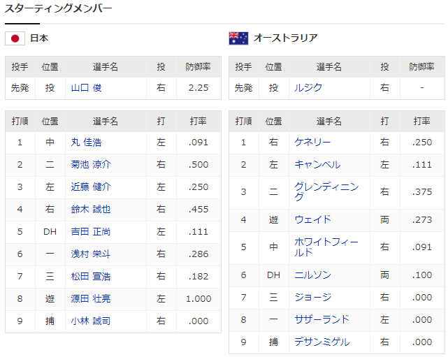 オーストラリア先発のデューシャン・ルジック投手は右サイドスローの変則投手。試合前に報道陣に対応した稲葉篤紀監督は「嫌らしさがありますね。ちょっとクロス気味でサイドスロー。右バッターは嫌でしょうね。惑わされないような打線を組みました」とコメント。右サイドハンド対策として、左打者を厚めに起用するオーダーを組んだ。