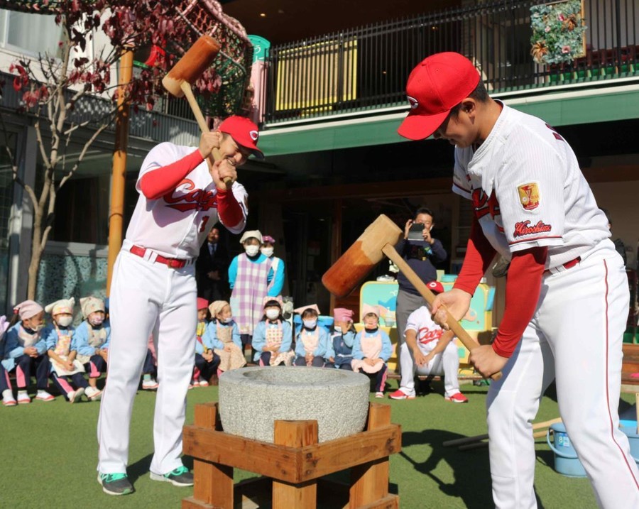 鈴木誠也らが餅つき大会 園児の「ペッタン、ペッタン」のかけ声に笑顔