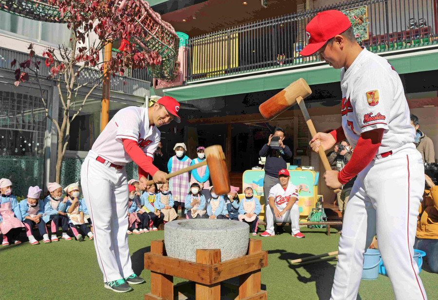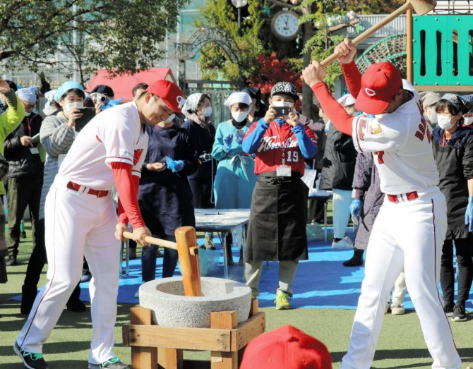 ・将来のカープファン獲得、プロ野球発展の為にも良い事です。日本の4番に餅をついて貰った子供達は将来自慢出来る良い思い出になった事でしょう。処で誠也は結婚したばかりなのに、奥さんの相手しないで大丈夫?