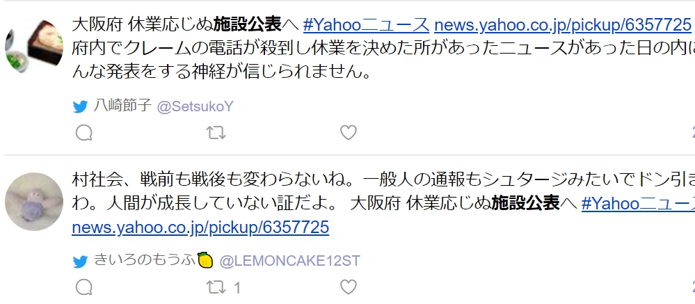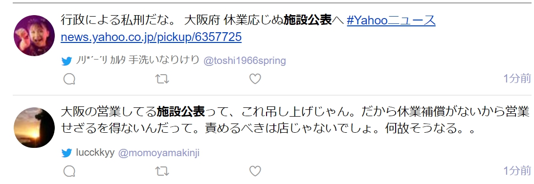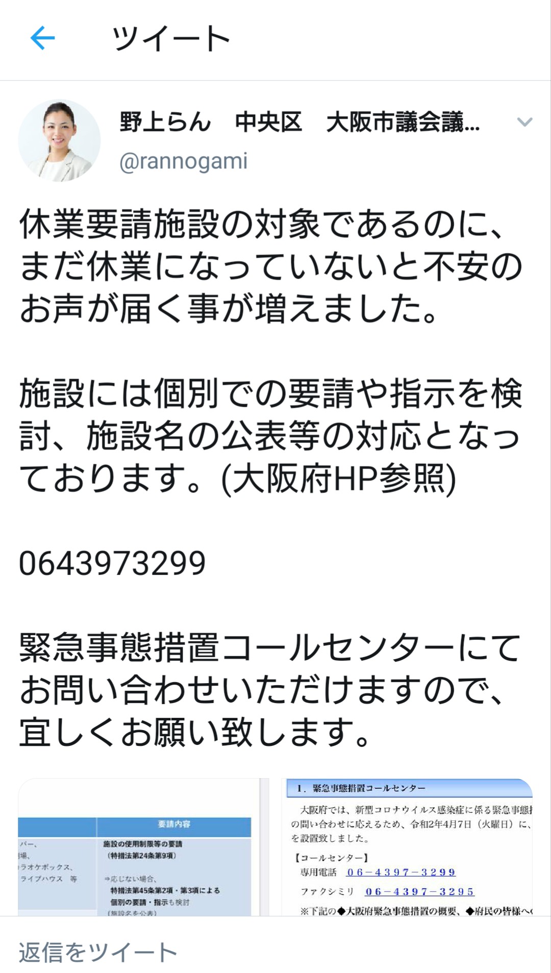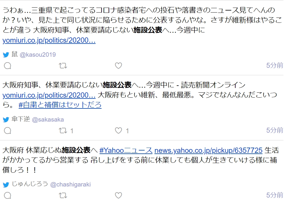 大阪府知事、休業要請応じない施設公表へ…今週中に 4/21(火)政府の緊急事態宣言を受け、大阪府が府内の商業施設などに休業を要請してから21日で1週間となる。吉村洋文知事は20日、休業要請に応じていない施設名の公表について「準備に入っている。今週中にやりたい」と述べた。改正新型インフルエンザ対策特別措置法では、施設休業の要請は「協力要請」「要請」「指示」の3段階あり、「要請」と「指示」の場合は施設名が公表される。現在は協力要請の段階だが、吉村知事は記者団に「看過できないものは現地に職員を派遣し、それでも難しい場合は、施設名公表を伴う『要請』をしたい」と述べた。