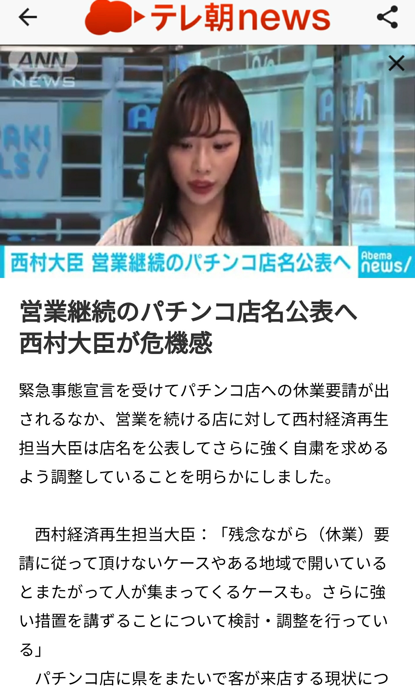 なのに大人がパチンコ店行って何が自粛だ。テレビもガラガラの梅田ばかりでなく、こういう所も映像で流してください