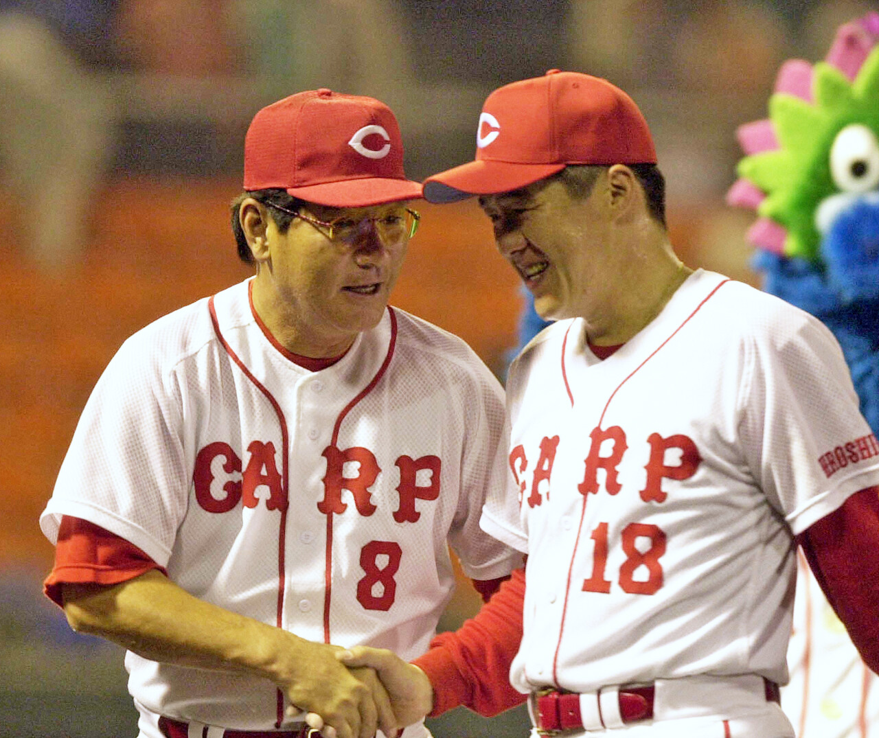 ※現役時代の広島佐々岡監督(右)と山本浩二氏