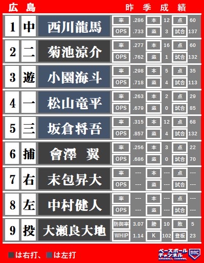 西川菊池小園松山坂倉會澤末包と大瀬良は確定やろな