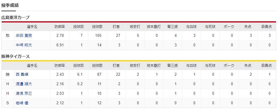 【広島】今季阪神戦初黒星 先制も先発床田寛樹が4回つかまり3失点