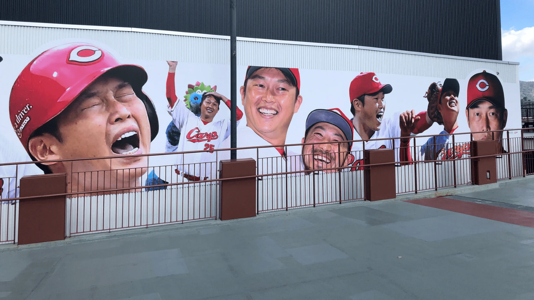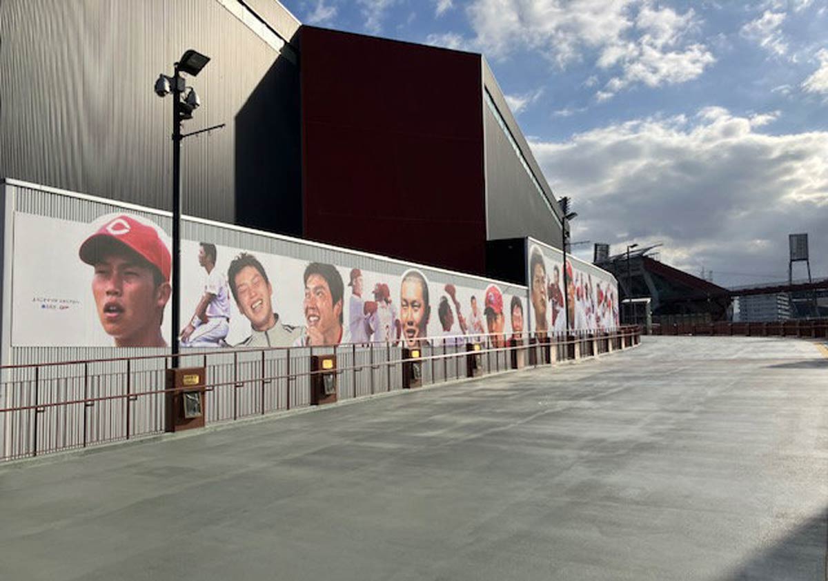 マツダスタジアム、メインゲートへ続くスロープの壁面ぜーんぶ新井さん!こんないじり方が許されるプロ野球監督って😂ヤシの木側にある低層の建物は「新井さん家2023ver.」だよ #carp