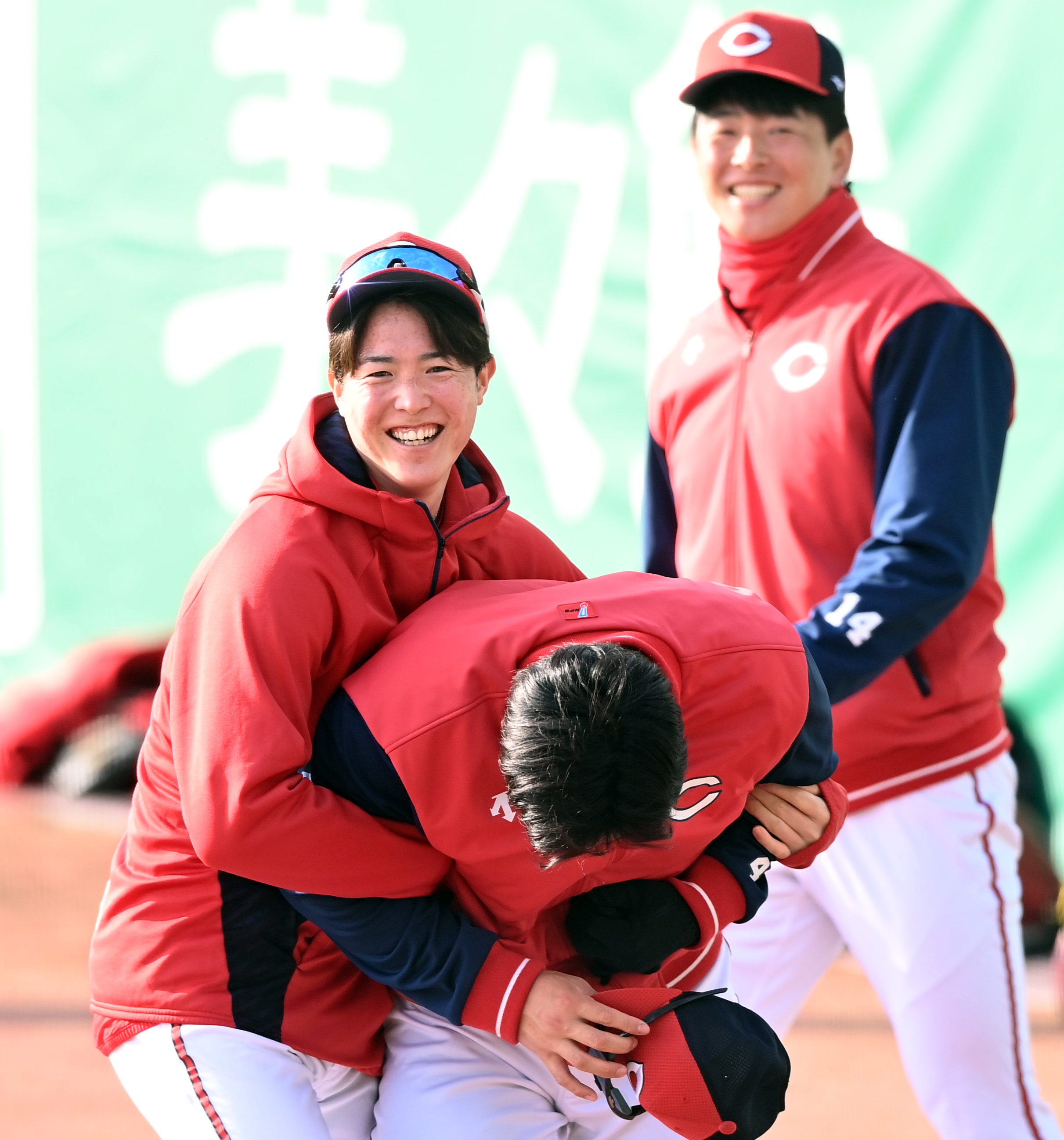 練習前、1軍に合流した林晃汰選手(中央)に抱きつく森下暢仁投手。奥の大瀬良大地投手も笑顔です!#森下暢仁 #大瀬良大地 #広島