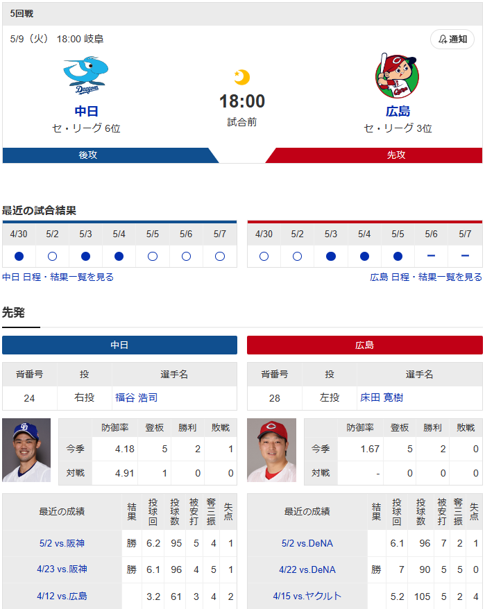 対する広島の先発は床田。今季は5試合中4試合でクオリティースタートを記録するなど、防御率1.67と安定した投球を続けている。中部学院大時代に慣れ親しんだマウンドで、今日も快投を披露できるか。