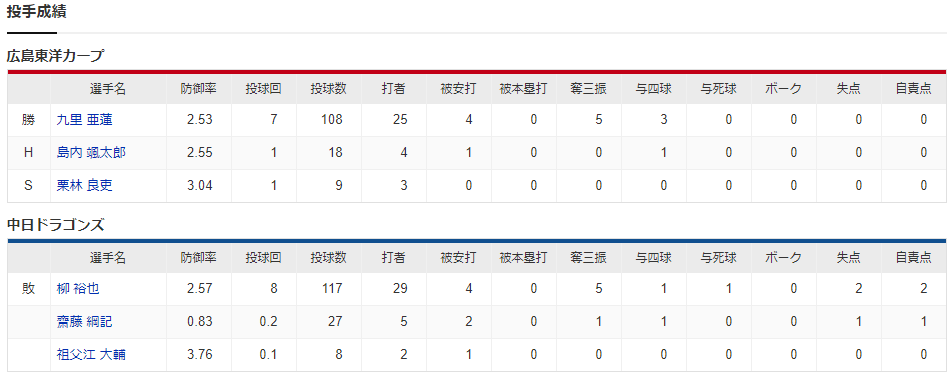 相対的やとつくづく思った、九里のボールスリーばかりのピッチング、今年の中日打線やからもったが他チームではヤバいわ。