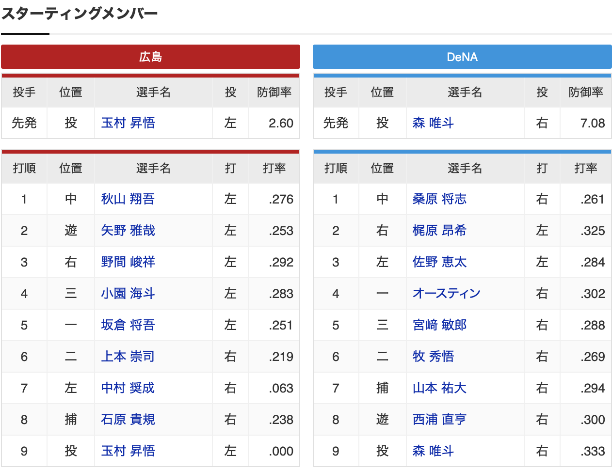 広島の先発は玉村。7月30日のDeNA戦では9回3失点8奪三振の快投を披露し、今季2勝目をプロ初完投で飾った。この一戦でもテンポの良い投球を展開し、相手打線を封じ込めるか。