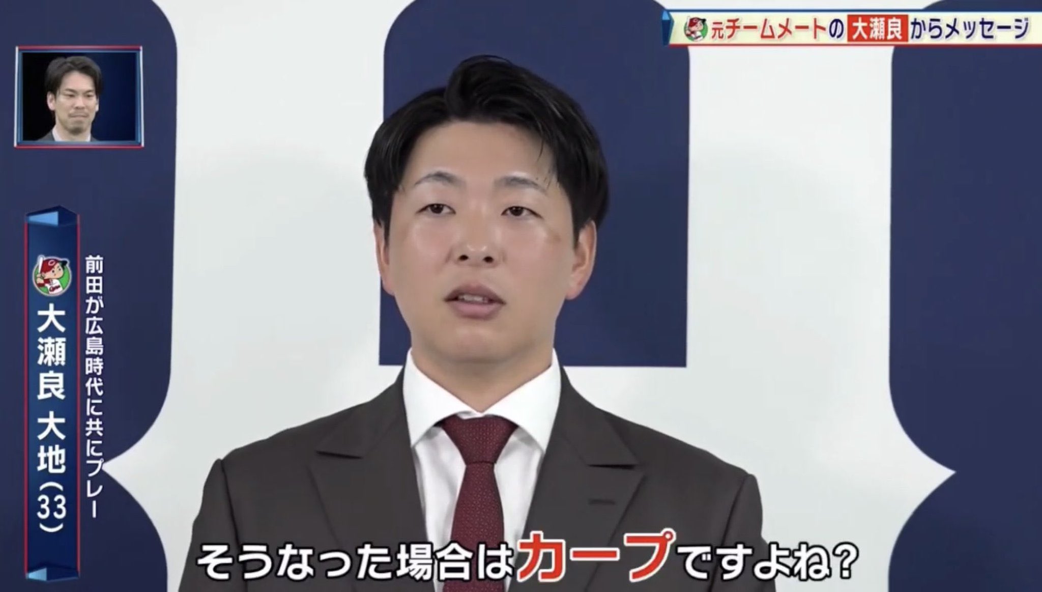 VTR出演した広島時代の同僚・大瀬良大地投手から「恩義を感じてカープに帰ってきます、よね」と言われ、「言い方悪い」と苦笑いしつつ「めちゃくちゃうれしい」と受け止めていた。