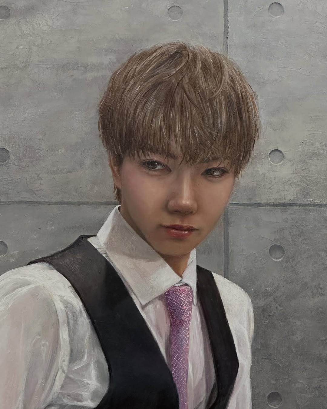 「お姉ちゃん達と違い、ちょっと嫌がってましたが協力してくれました(ありがとう息子)私の絵は9室にあります。足を運んで頂けたら嬉しいです」と呼びかけ、「#絵画#人物画#油絵」とハッシュタグに記した。
