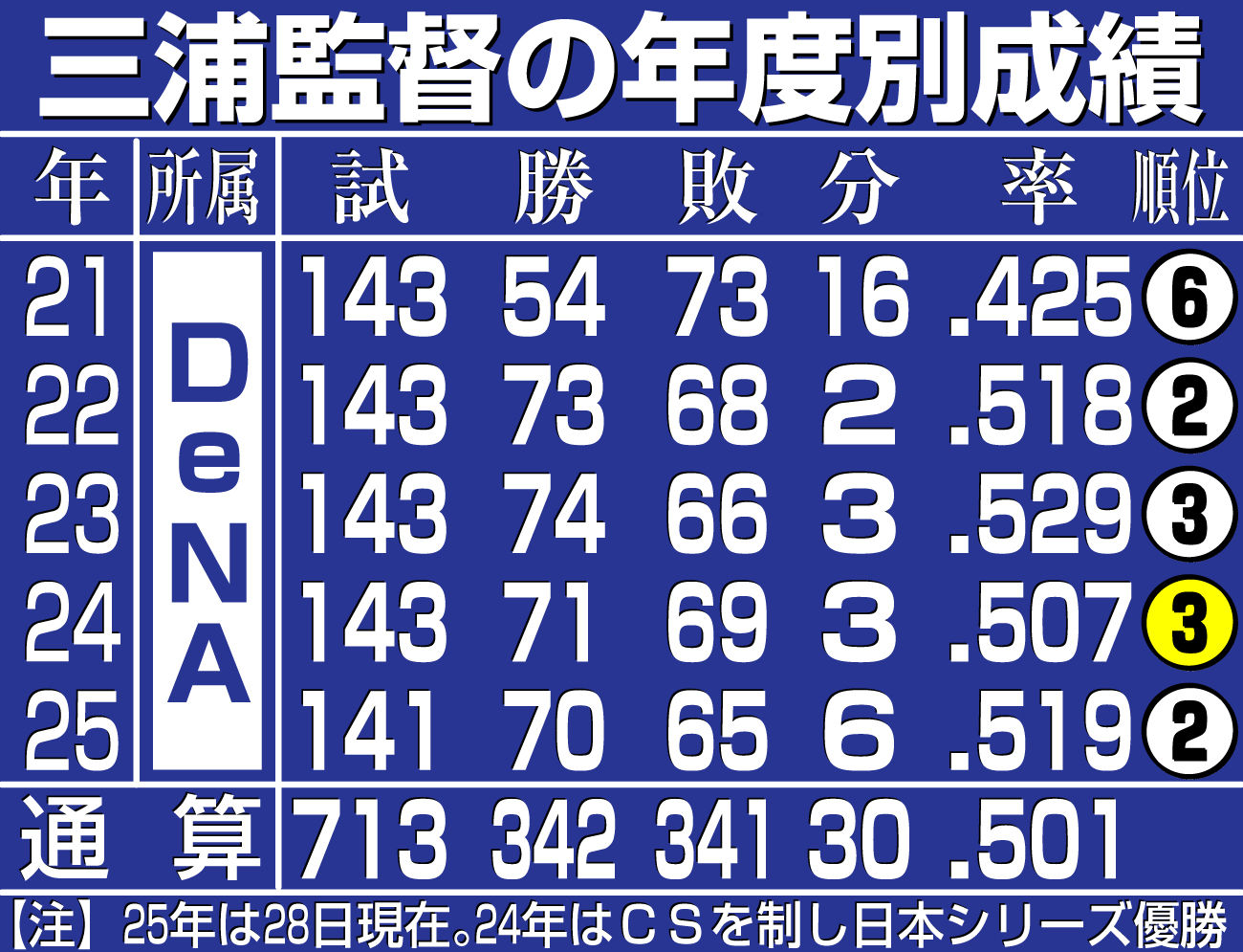 “ハマの番長”が決断した。DeNA三浦監督が今季限りで辞任することが決まった。昨年はセ・リーグ3位から26年ぶりに日本シリーズを制覇。常勝軍団を構築すべくリーグ優勝を目指した今季だったが、12球団最長ブランクとなる27年連続V逸となった。
