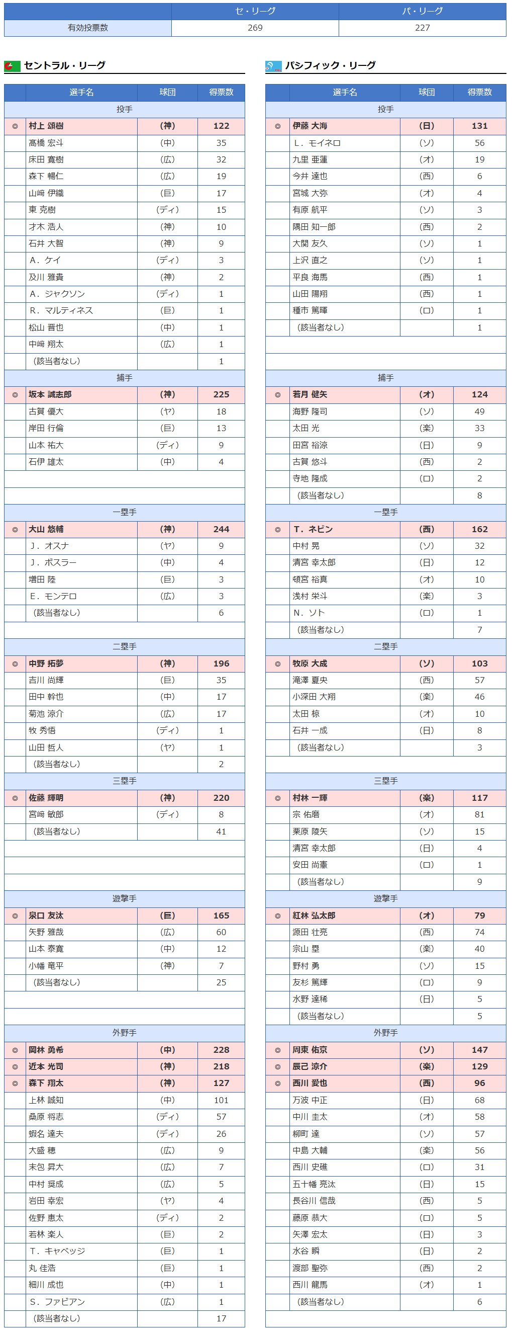 ◎ 坂本誠志郎 阪神タイガース 225票 2年ぶり2回目