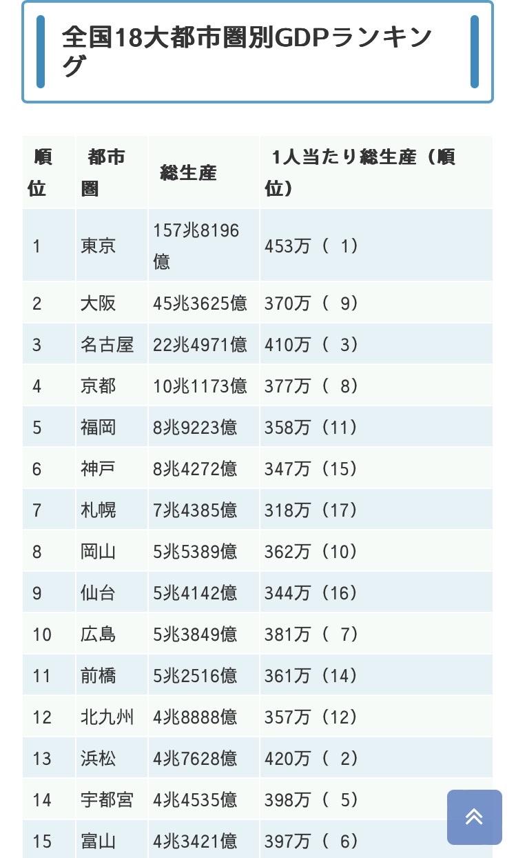 都市圏なら東京大阪名古屋に次ぐと言うが実は都市圏区分って曖昧だし、南関東を東京一括りにしたり、複数の都市や都市圏に分散してるだけの兵庫福岡より上に見せてるだけだよね。だって人口500万人以上いる兵庫福岡より250万人の京都が上にはならんよ。