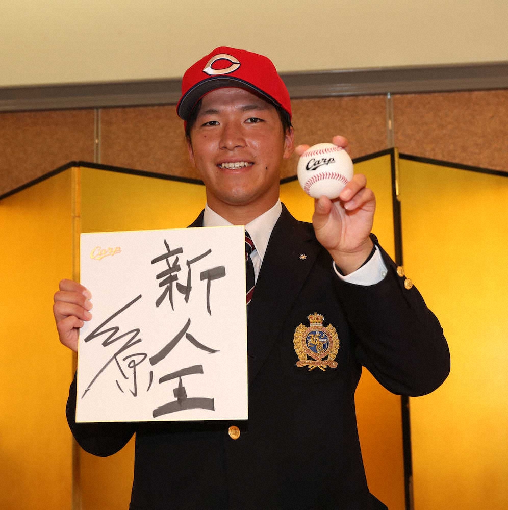 広島ドラフト3位・勝田成が仮契約、高校の先輩・岡田彰布氏に「少しでも近づけるように」
