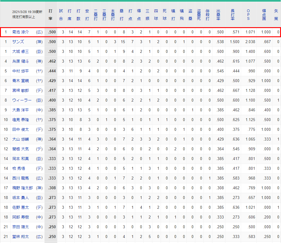 菊池 .500 7安打 0HR 3打点 出塁.500 OPS1.071 得点圏0.000
