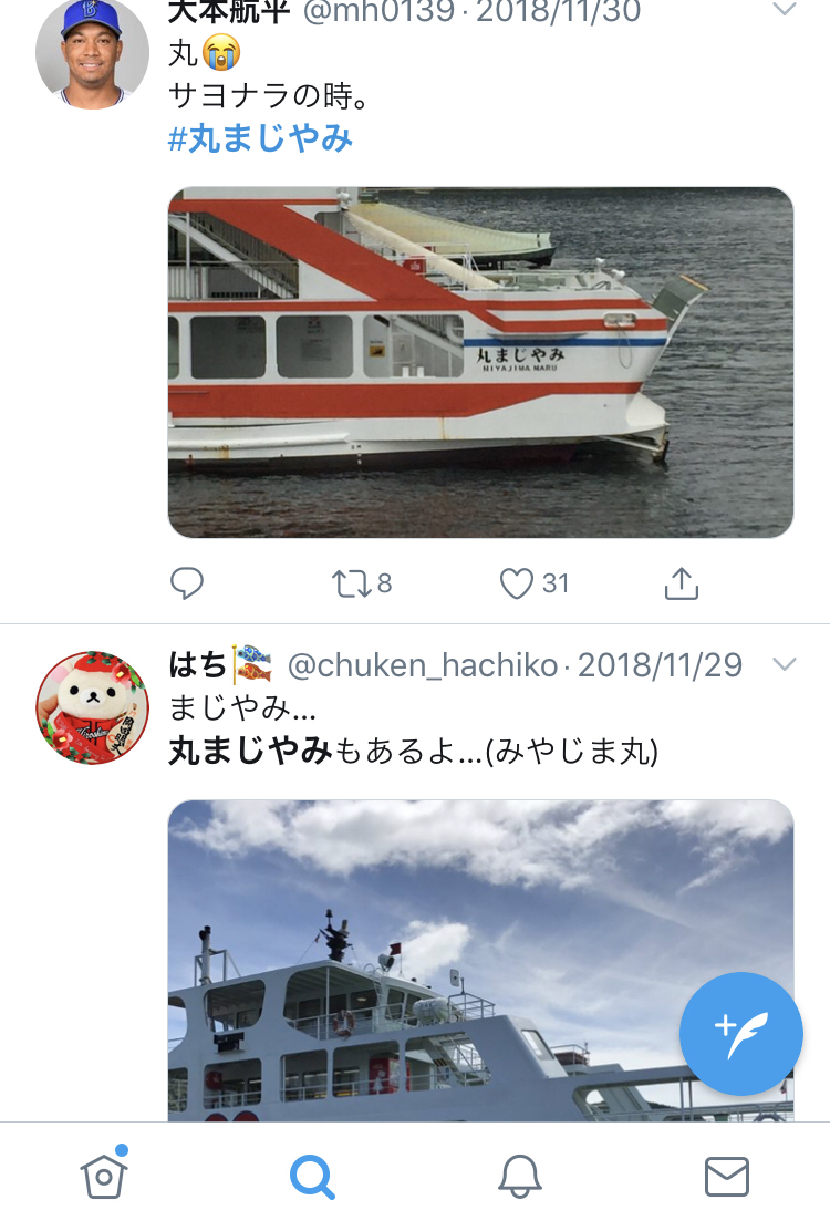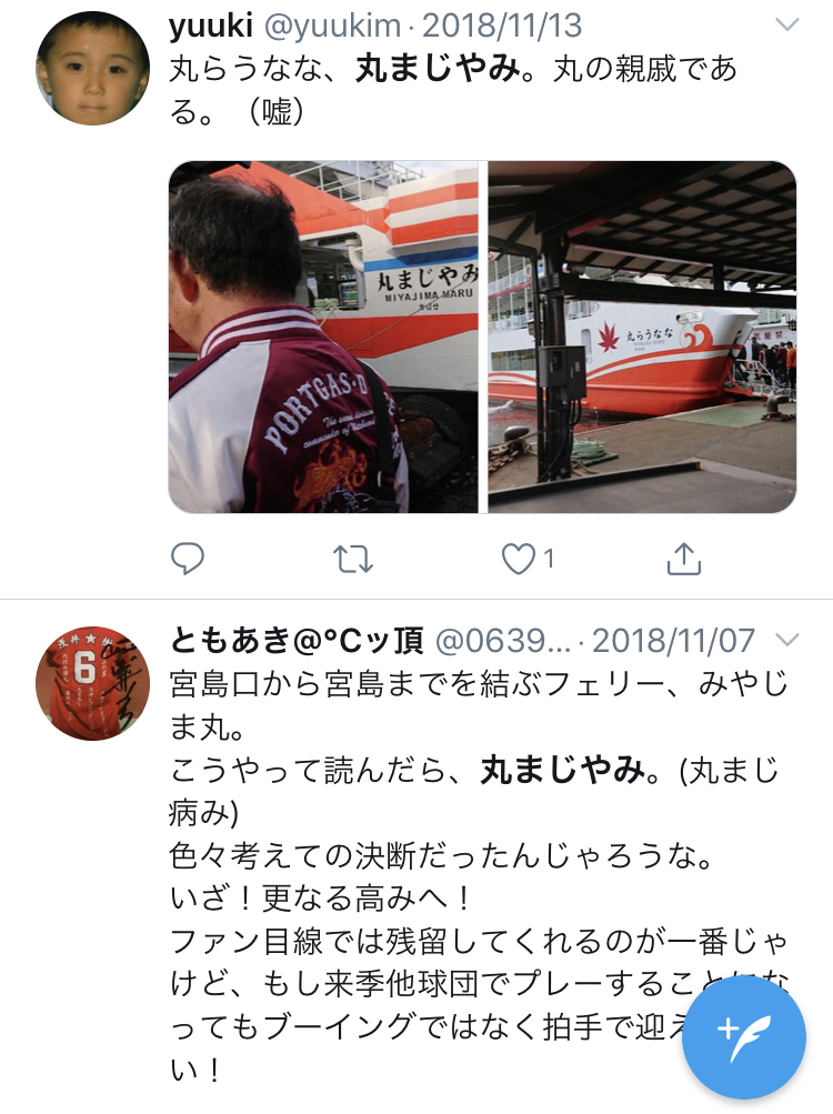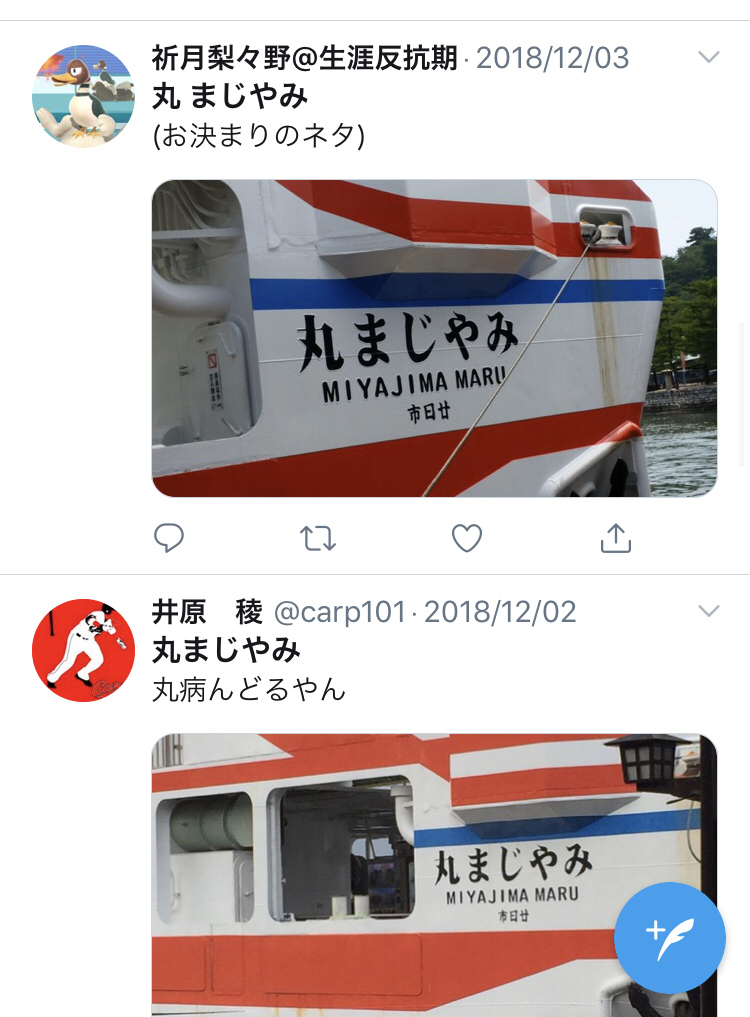 ていうか。「丸まじやみ」と読めるヂャーないか!カープファンとしてはスルーできなひ!!最近打撃下降線やし…“@m8oakl: 今日一番の発見は、「宮島」を逆から読むと「マジ病み...」になるということでしたまる