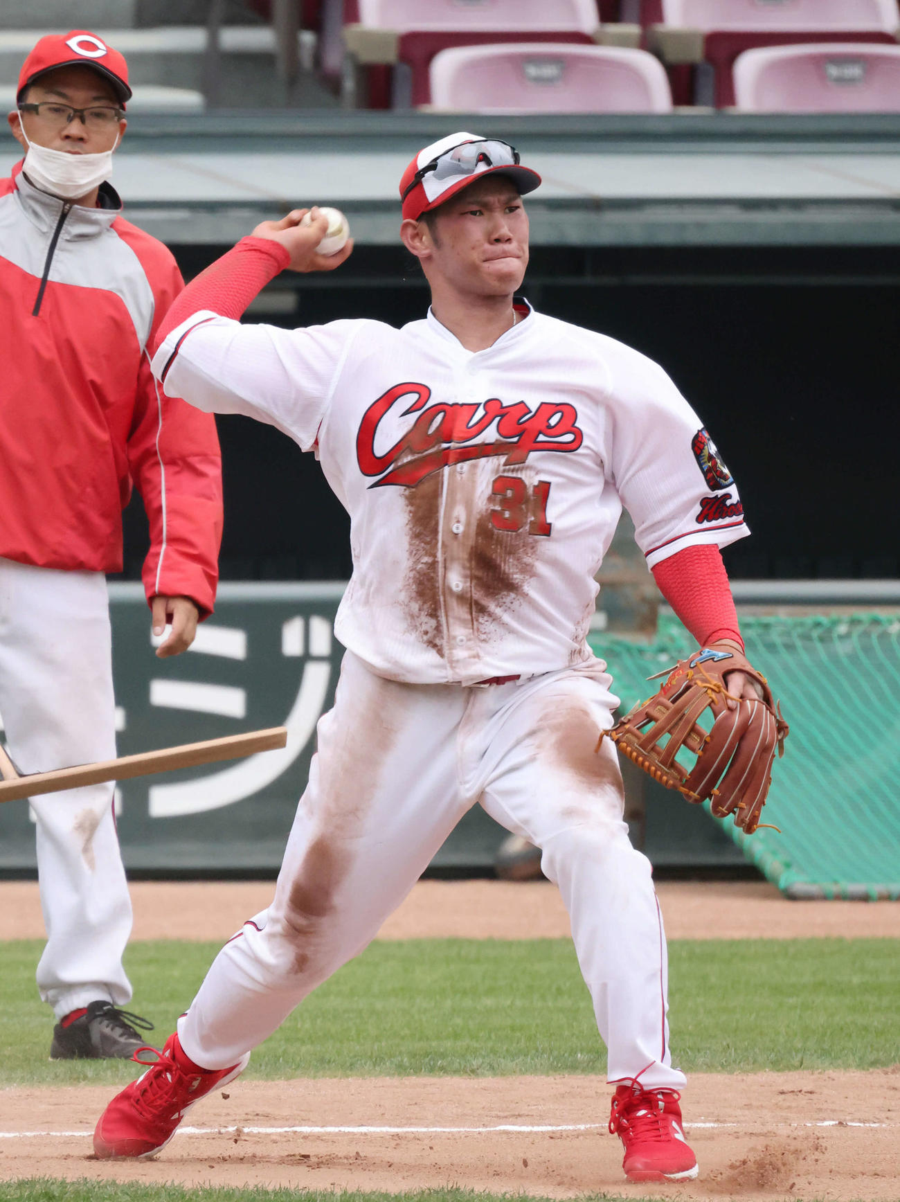 ほかの捕手がキャッチャーミットで内野ノックを受ける中、坂倉は内野用グラブで白球を追った。今季は新たに挑戦した一塁でも63試合に出場。来季は一塁手の新外国人マクブルームが加入。出場の幅を増やすため、さらに三塁に挑戦することが決まった。