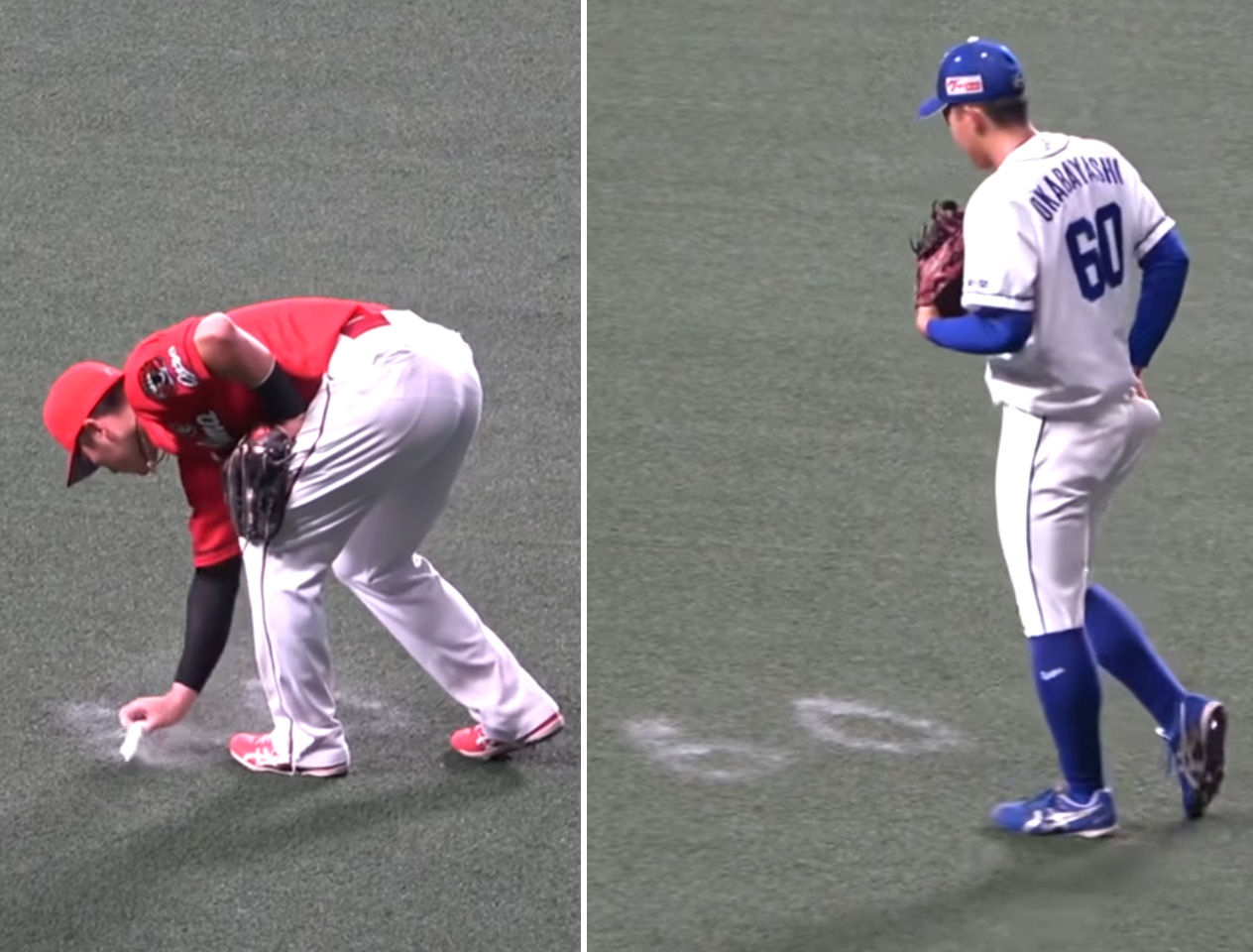 試合中、思わぬコミュニケーションもあった。同じ右翼の守備につく広島・鈴木誠が、ポケットに忍ばせたロジンで岡林の背番号「60」とグラウンドに記していた。