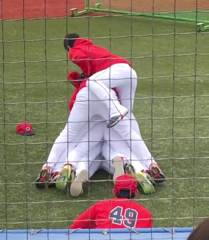 カープ長野&鈴木誠也らが上本に乗り6段重ね!完全にチームに馴染む