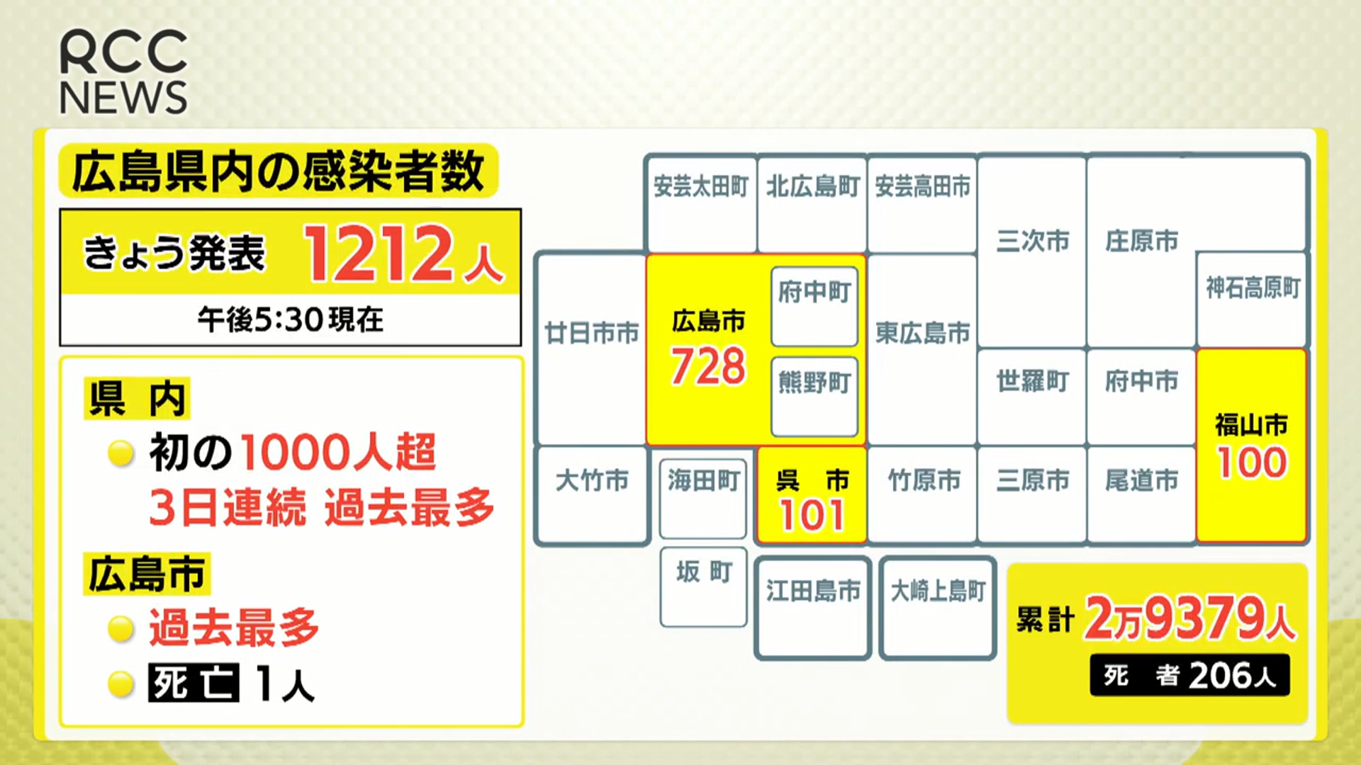 このうち広島市は過去最多の728人の感染確認と患者1人の死亡を、呉市は101人、福山市は100人の感染確認を発表しています。