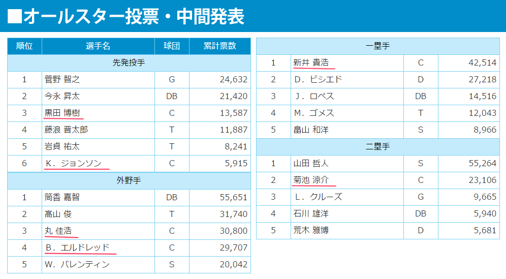 日本野球機構(NPB)は23日、「マイナビオールスターゲーム2025」(7月23日=京セラドーム大阪、同24日=横浜スタジアム)のファン投票最終中間発表を行った。