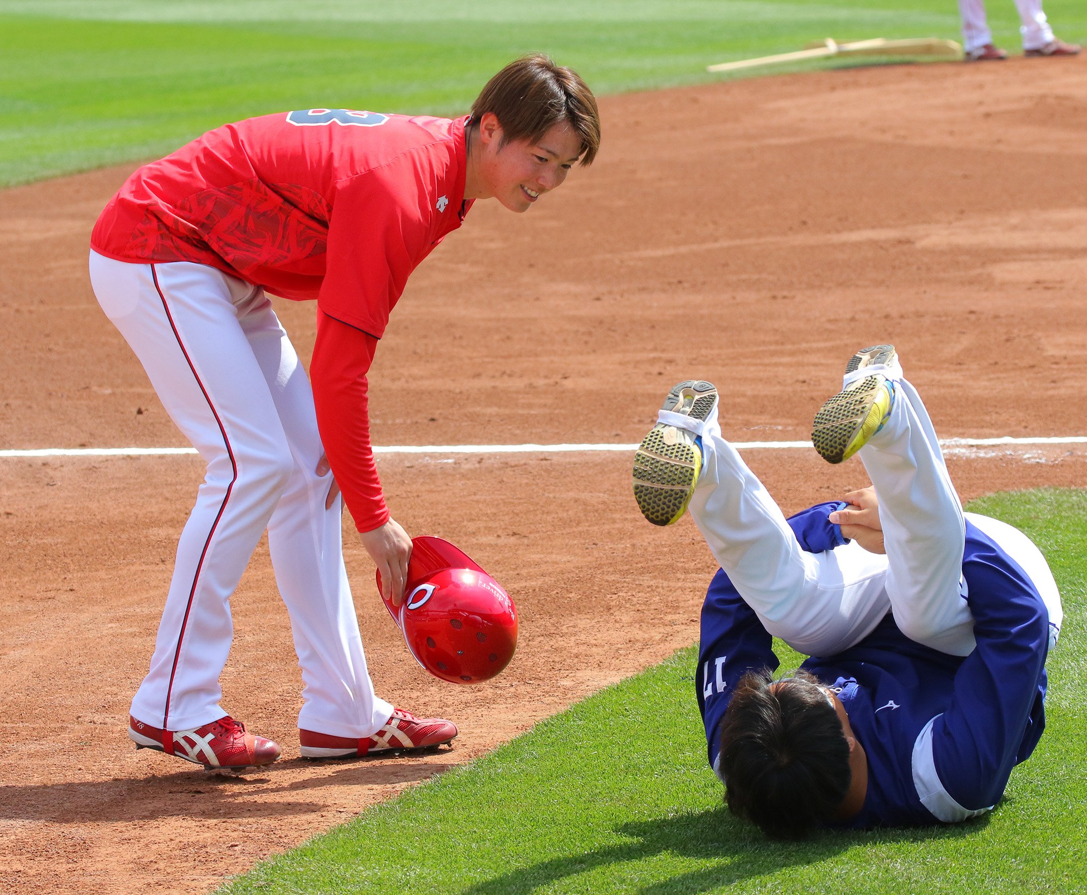 ■『駒大の先輩』&『現役時代の恩師』である野村謙二郎がカープを視察→直立不動で先輩の話を聞く新井監督が「先生に怒られてる生徒みたい」だと話題に