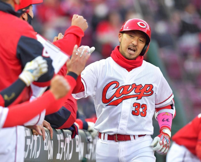 広島 大盛がプロ初の先頭打者弾!初球を右翼席へたたきこむ