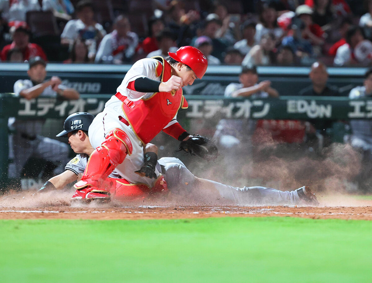 山本貴責任審判は「本塁が空いていた、タイミングアウト、そこで判断した」と説明。走者との交錯を避けるため、捕手は本塁前に立って捕球するのが原則。捕手の会沢は捕球前からベースをまたぐ形となったが、吉本審判は「本来は前に立たないといけない。難しい判断だったのはそこです。ただベースを空けていた、なおかつタイミングはアウトだったので、判定通りの結果を出した」と話した。