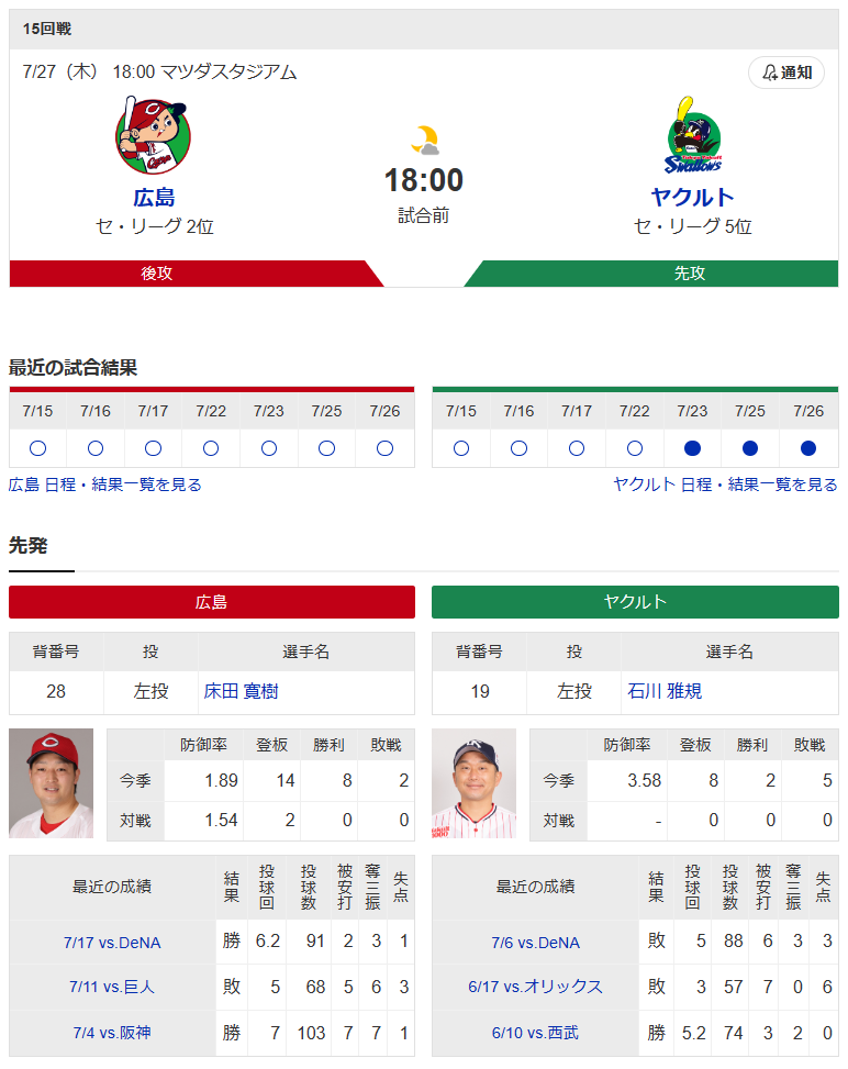 対するヤクルトの先発は石川。6月27日の広島戦では白星こそつかなかったものの、今季最長の6イニングを投げて2失点に抑えた。今日のマウンドでも熟練の投球術を披露し、今季2勝目をつかみたい。