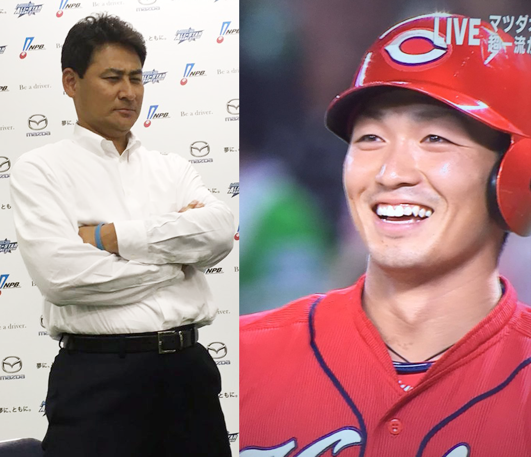 新井選手がサヨナラホームランを放ち、バットを高々と放り投げている姿をデザインしています。