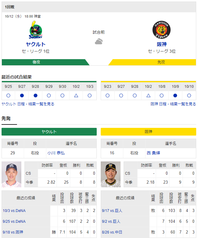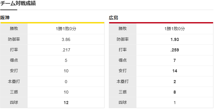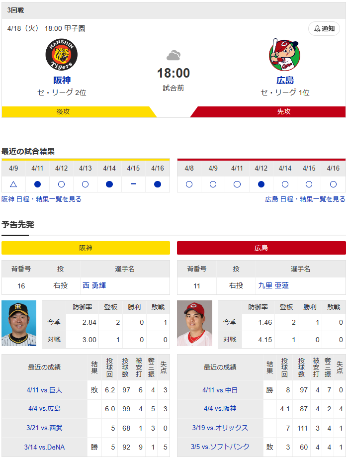 対する阪神の先発は西勇。4月11日の広島との前回対戦では勝ち星こそつかなかったものの、8回無失点の好投を披露した。この試合でも相手打線を抑え込み、今季2勝目を挙げられるか。