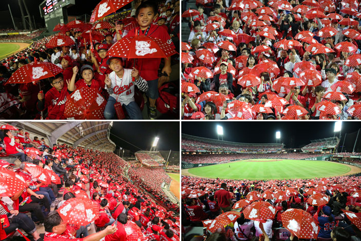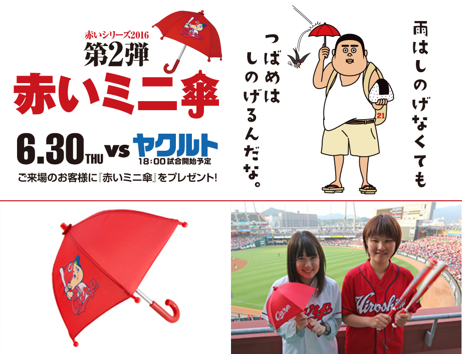 第2弾では、赤グッズの中でも人気の「赤傘」を来場者全員にプレゼント!「赤傘」を使用したパフォーマンスで、球場を盛り上げていただきたいと思います。プレゼントは対象試合当日、入場時に各ゲートにてお受け取りください。(入場券をお持ちの方、お1人様につき1個)<赤傘2021>
