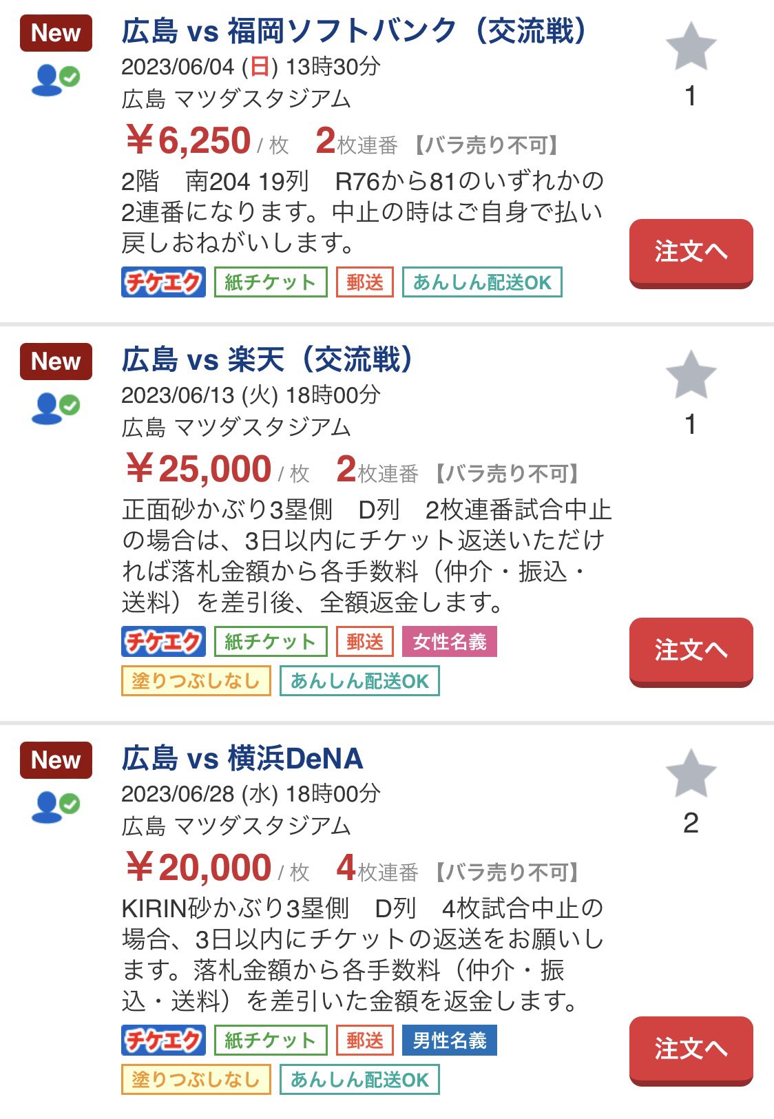 ※カープのチケットが2023年度も多数オークションサイトで転売される→カープファンから「いいかげん球団に対策してもらいたい」という意見が多数出る→ガチの転売屋がチケット転売を肯定する書き込みを連投し議論になる。