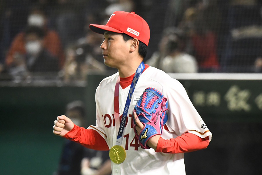 トヨタ自動車時代の背番号14のユニホームを身に着け、今夏の東京五輪で獲得した金メダルを首にかけて登場した栗林の投球は高めに抜けるボールとなり「緊張があった中でいいボールは投げられませんでしたが、無事に投げられてよかった。マウンドを汚さないことと、バッターに当てないことだけを考えた」と笑顔を見せた。