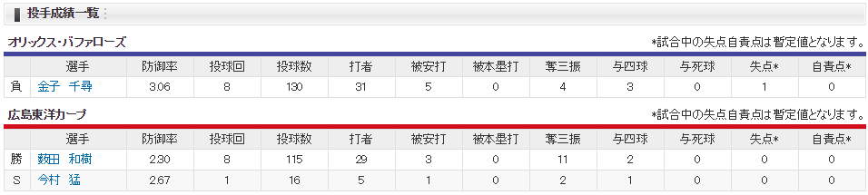 0-0の八回、先頭の会沢が二失で出塁。代打石原が投前へ犠打を決め1死二塁とし、田中が右線に決勝二塁打を放った。 先発のい薮田は8回3安打無失点の好投で6勝目を挙げた。