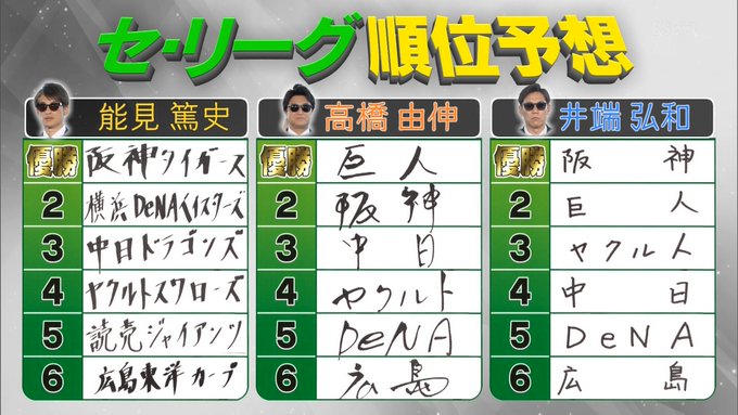 能見-由伸-井端の順位予想、カープ最下位で全員一致…