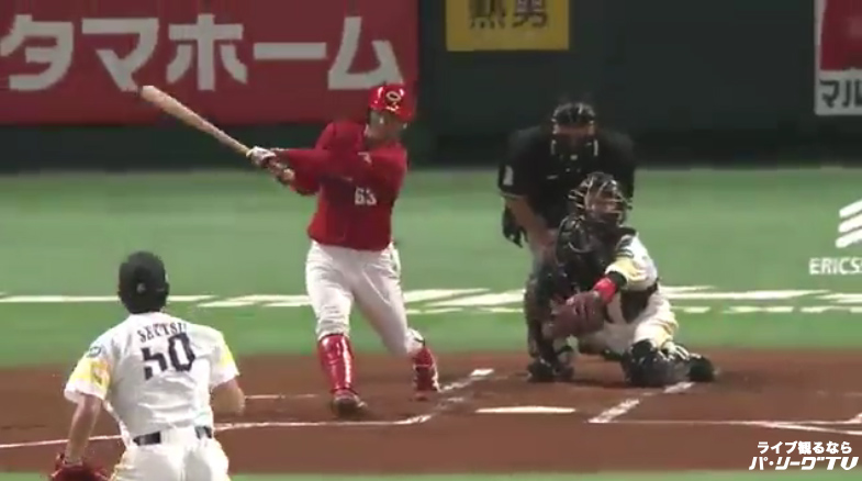 2点を追う四回だ。2死一塁で相手先発・井上のカーブに泳ぎながら、左翼スタンドへ運んだ。